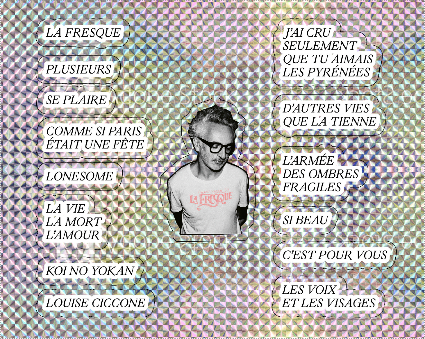 Planche de stickers des 14 titres de "La fresque" + un sticker portrait Vincent Delerm